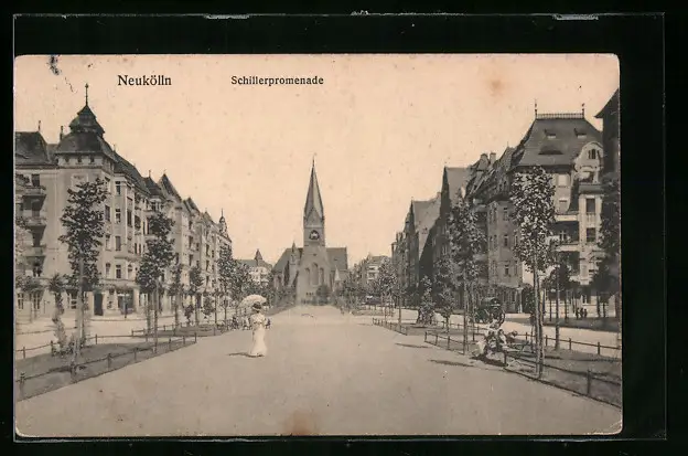 AK Berlin-Neukölln, Partie an der Schillerpromenade mit Kirche
