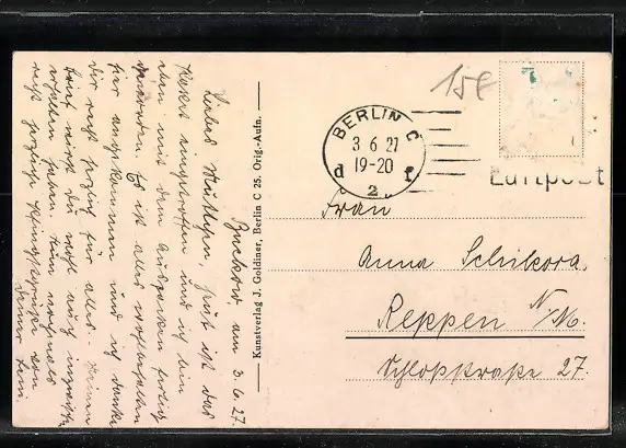 alte Ansichtskarte, gelaufen 1927, Briefmarke entfernt, guter Zustand