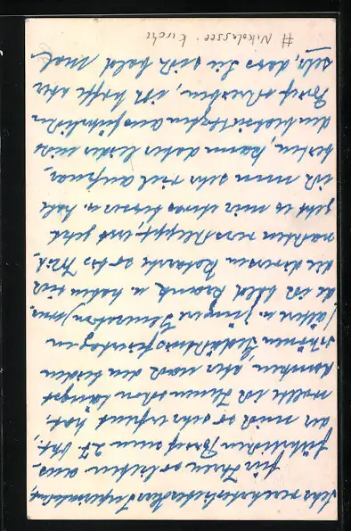 Personenbezogene Daten auf der Rückseite der Karte wurden durch blauen Textmarker unkenntlich gemacht. Die blauen Stellen sind auf die Vorderseite durchgeweicht und wirken sich negativ auf das Postkartenfoto aus