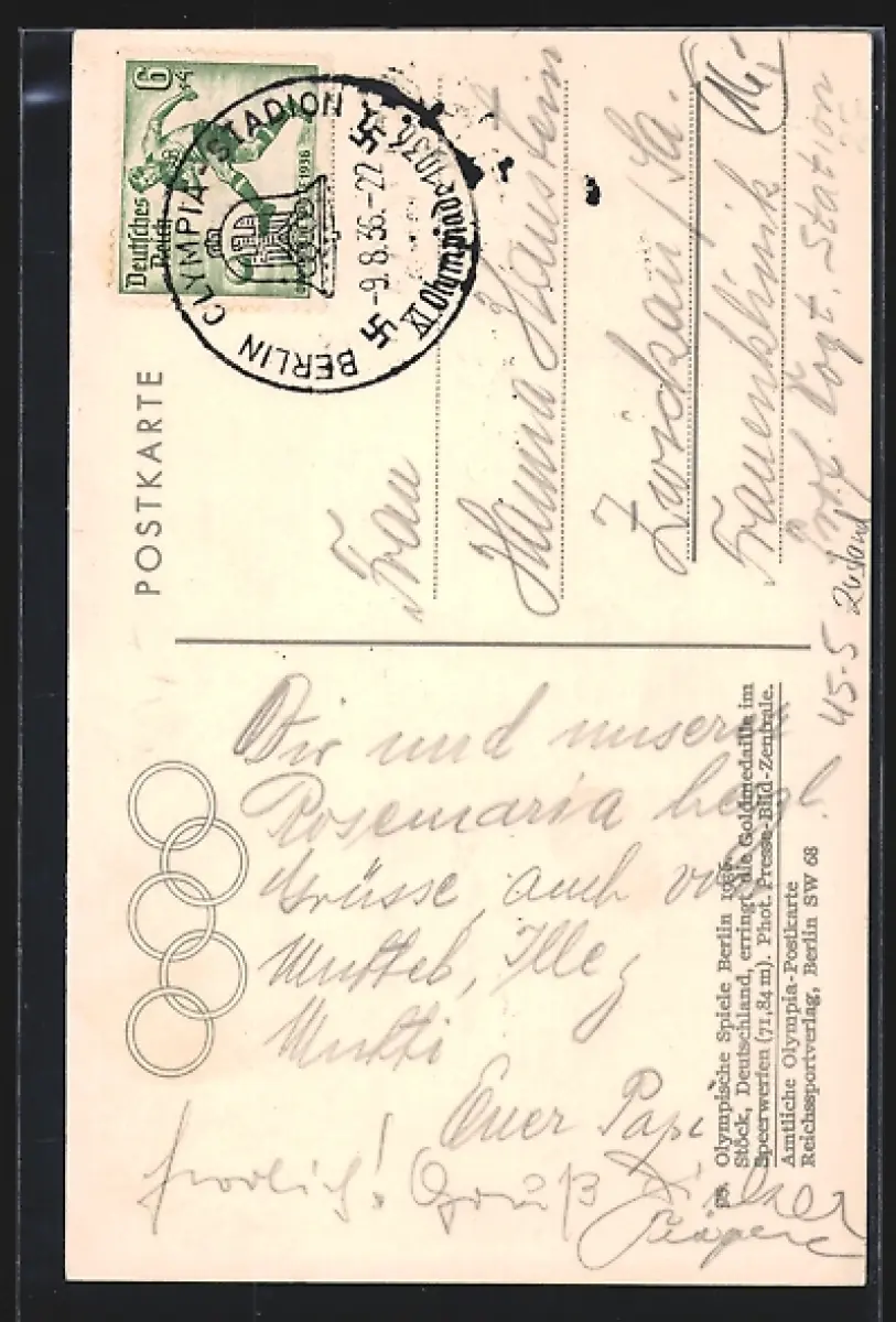 AK Berlin, Olympische Spiele 1936, Gerhard Stöck erringt die Goldmedaille im Speerwerfen