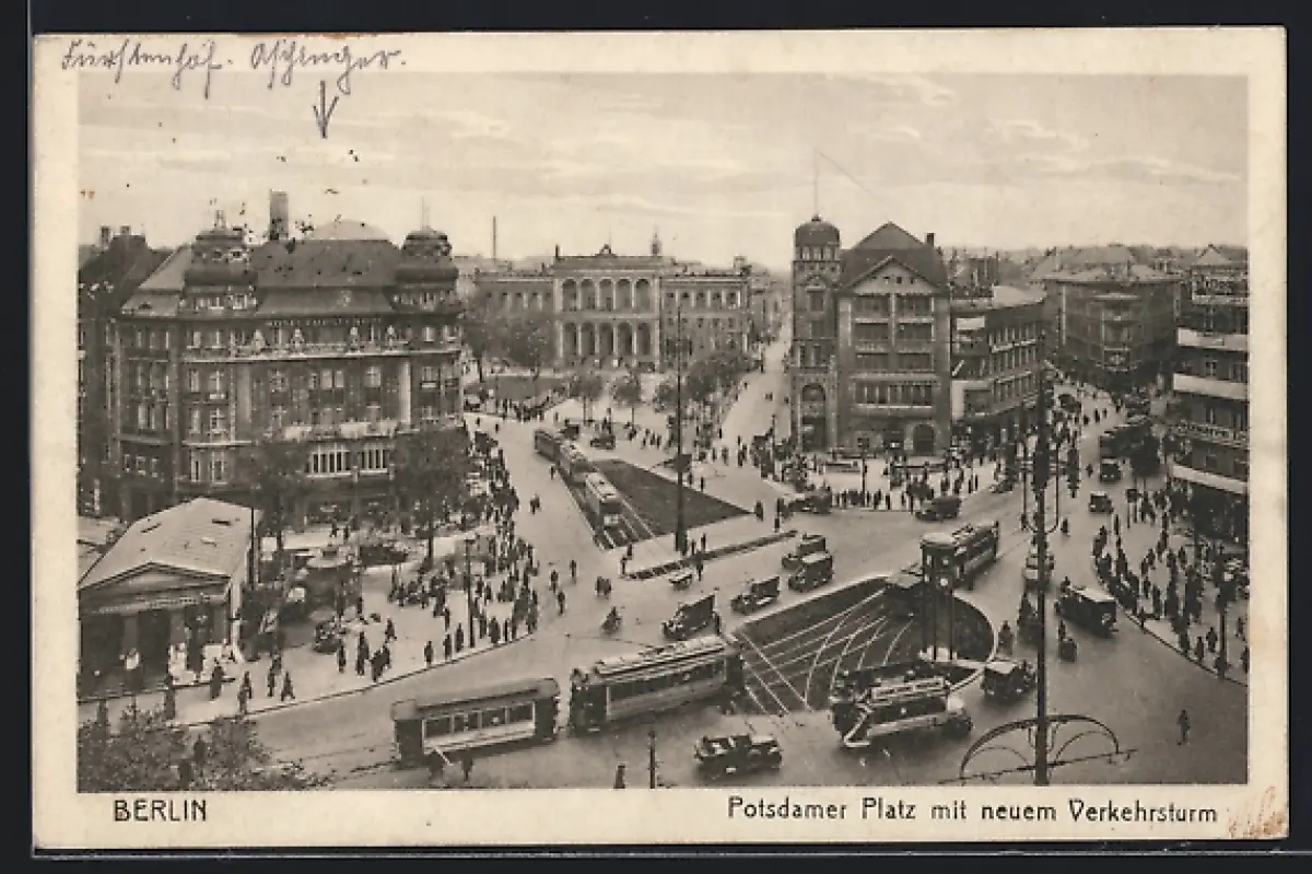 AK Berlin, Potsdamer Platz mit neuem Verkehrsturm, Strassenbahn