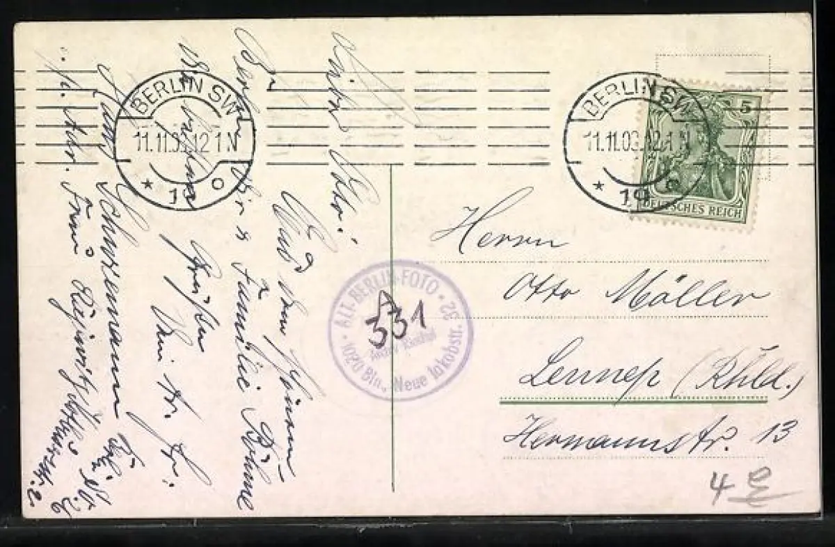 Personenbezogene Daten auf der Rückseite der Karte wurden durch blauen Textmarker unkenntlich gemacht. Die blauen Stellen sind auf die Vorderseite durchgeweicht und wirken sich negativ auf das Postkartenfoto aus