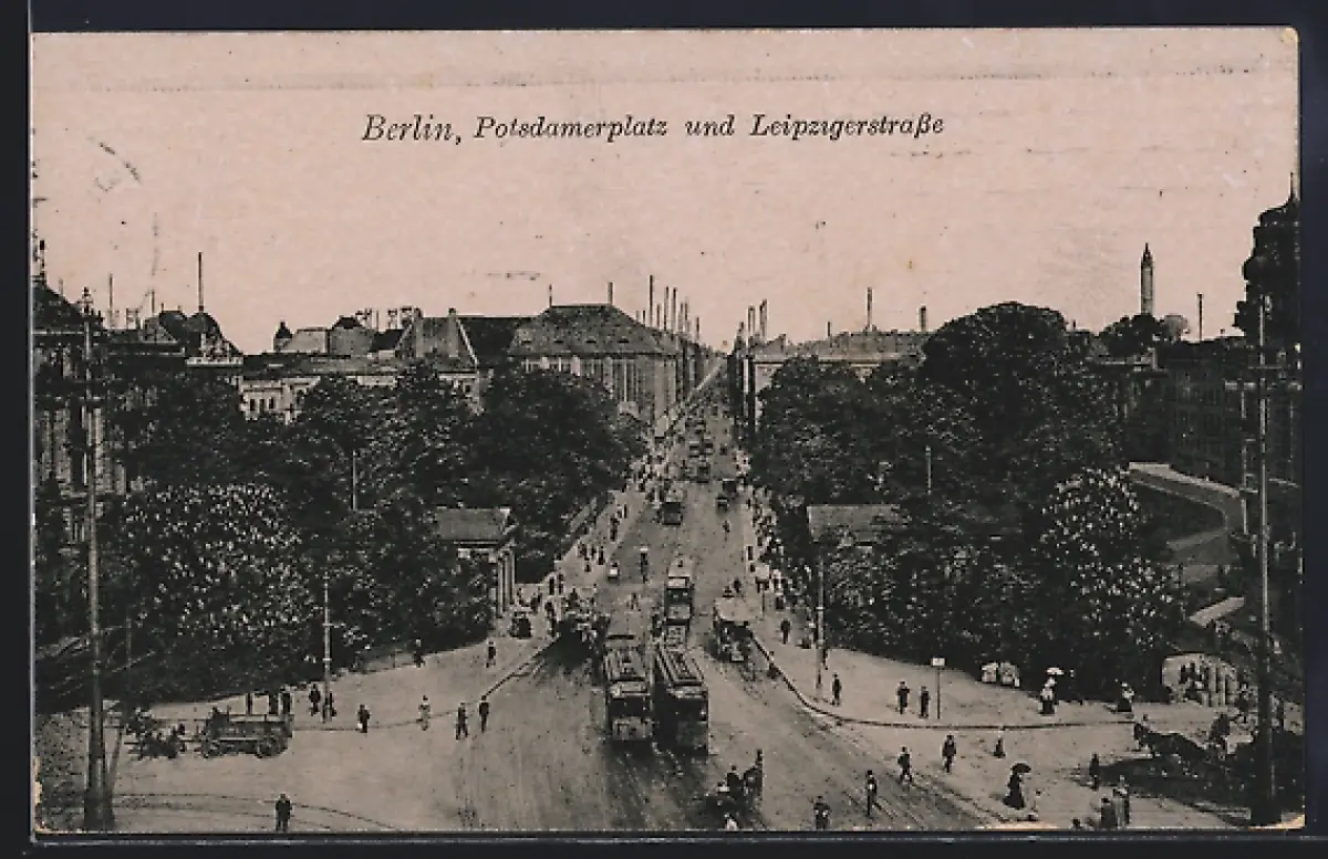 AK Berlin, Potsdamerpletz mit Leipzigerstrasse aus der Vogelschau, Strassenbahn
