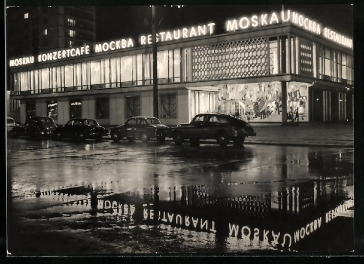 AK Berlin, Restaurant Moskau, Karl-Marx-Allee, bei Nacht