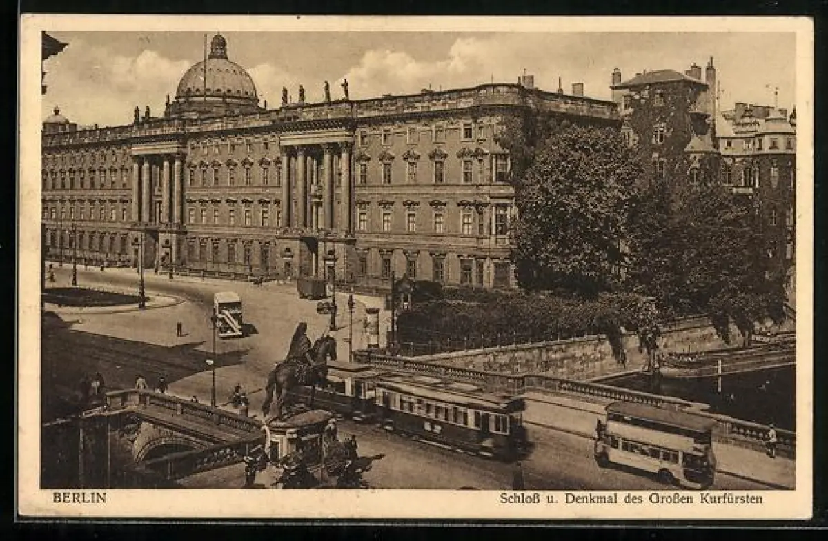 AK Berlin, Schloss u. Denkmal des Gr. Kurfürsten, mit Strassenbahn