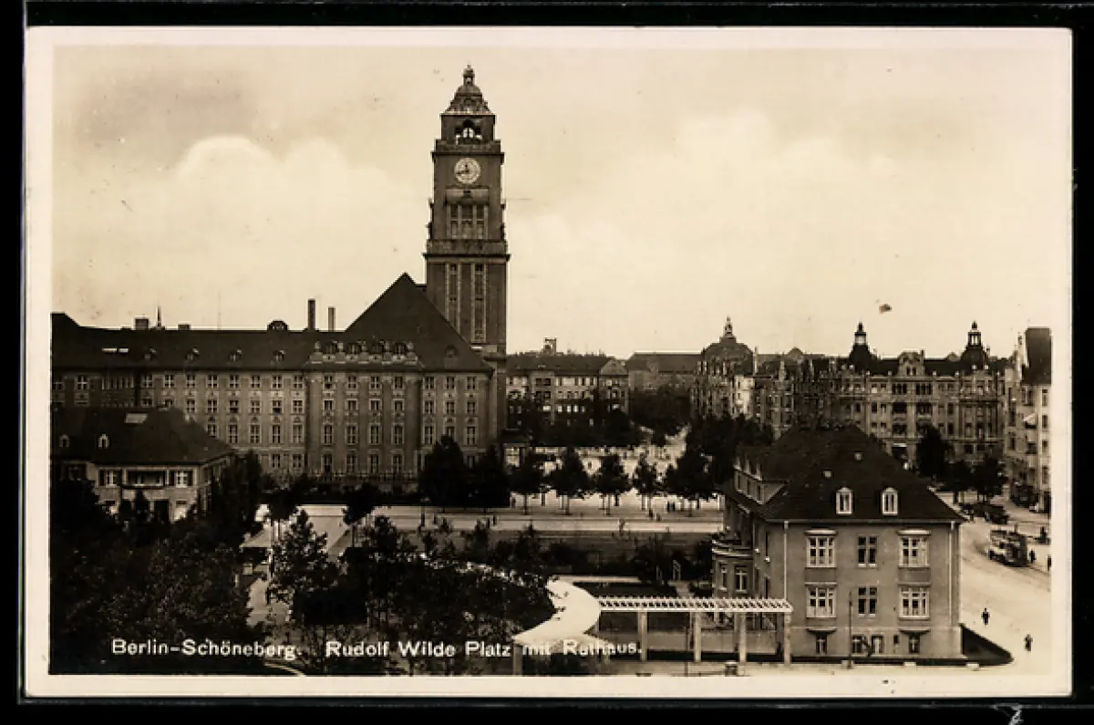 AK Berlin-Schöneberg, Rudolf Wilde Platz mit Rathaus und Strassenbahn
