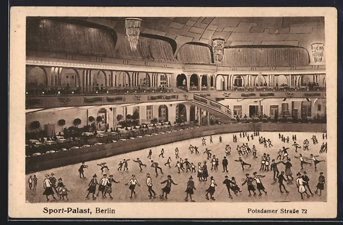 AK Berlin-Schöneberg, Sport-Palast mit Eisläufern, Postdamer Strasse 72, Innenansicht