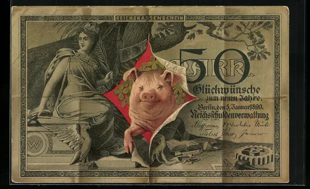 AK Berlin, Schwein durch zerrissenen Geldschein, Neujahrsgruss 1899