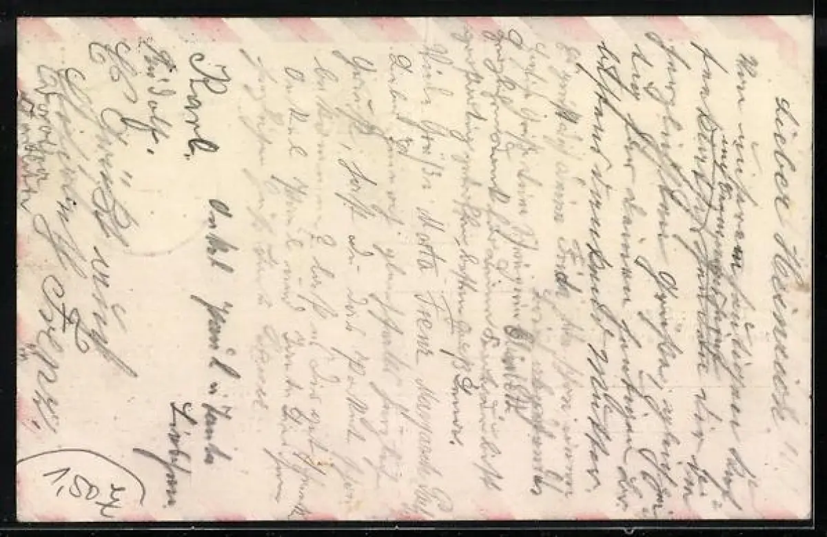 Personenbezogene Daten auf der Rückseite der Karte wurden durch blauen Textmarker unkenntlich gemacht. Die blauen Stellen sind auf die Vorderseite durchgeweicht und wirken sich negativ auf das Postkartenfoto aus
