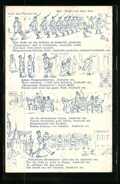 AK Berlin, Soldaten marschieren mit dem Hauptmann, Bahnhof, Rathaus, Text