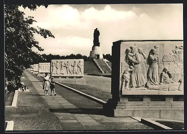 AK Berlin, Sowjetisches Ehrenmal in Treptow mit besuchender Mutter und Sohn