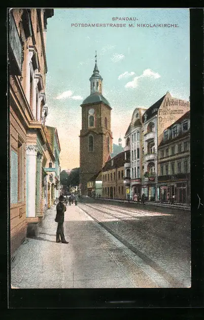 AK Berlin-Spandau, Potsdamerstrasse mit Blick zur Nikolaikirche