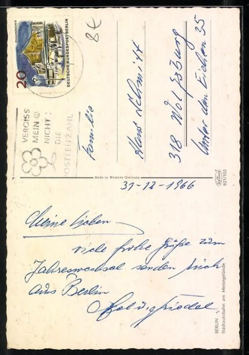 Personenbezogene Daten auf der Rückseite der Karte wurden durch blauen Textmarker unkenntlich gemacht. Die blauen Stellen sind auf die Vorderseite durchgeweicht und wirken sich negativ auf das Postkartenfoto aus
