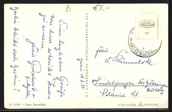 Personenbezogene Daten auf der Rückseite der Karte wurden durch blauen Textmarker unkenntlich gemacht. Die blauen Stellen sind auf die Vorderseite durchgeweicht und wirken sich negativ auf das Postkartenfoto aus