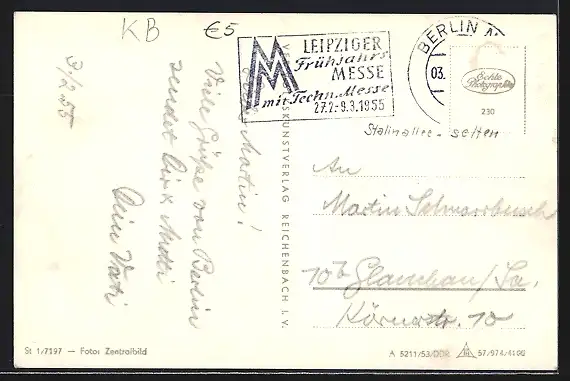 Personenbezogene Daten auf der Rückseite der Karte wurden durch blauen Textmarker unkenntlich gemacht. Die blauen Stellen sind auf die Vorderseite durchgeweicht und wirken sich negativ auf das Postkartenfoto aus