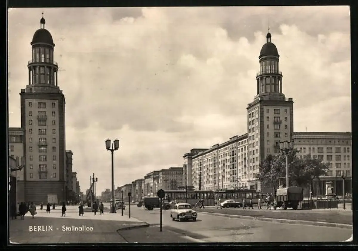 AK Berlin, Stalinallee mit Strassenbahn und Passanten
