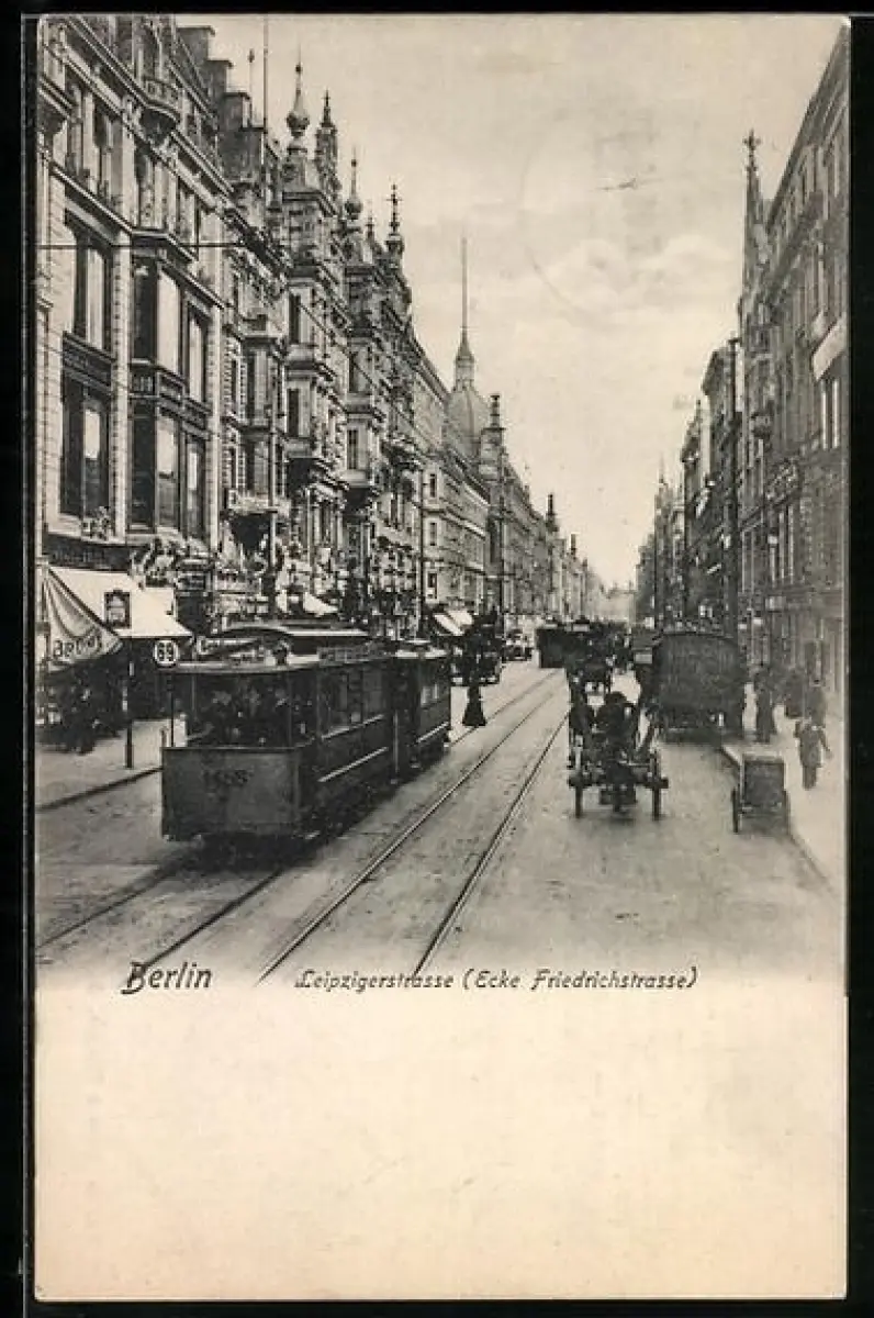 AK Berlin, Strassenbahn auf der Leipzigerstrasse Ecke Friedrichstrasse mit Geschäften