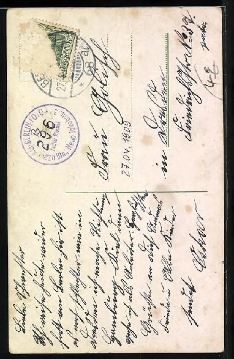 Personenbezogene Daten auf der Rückseite der Karte wurden durch blauen Textmarker unkenntlich gemacht. Die blauen Stellen sind auf die Vorderseite durchgeweicht und wirken sich negativ auf das Postkartenfoto aus
