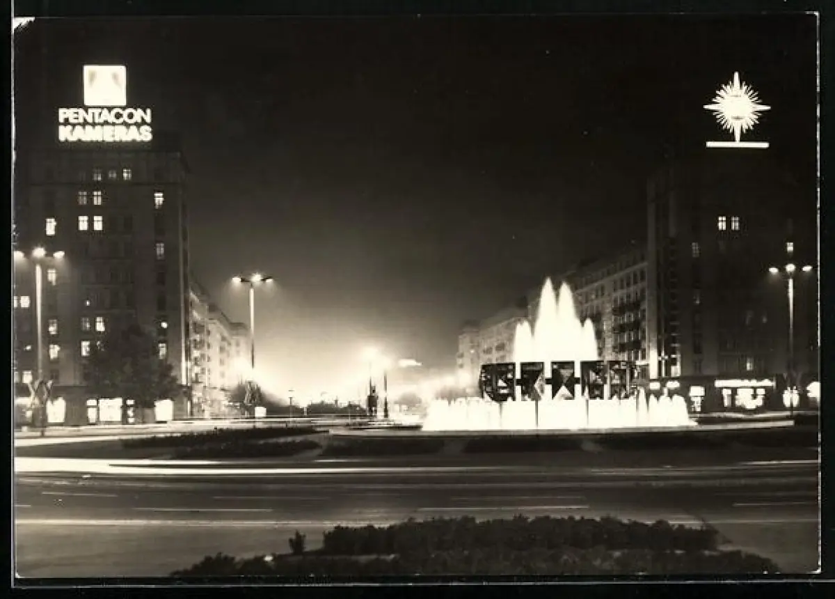 AK Berlin, Strausberger Platz mit Geschäfthäusern bei Nacht