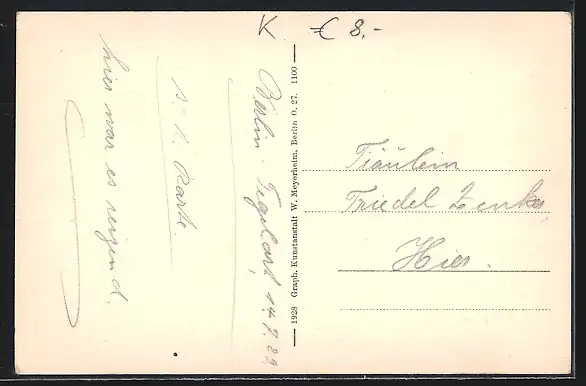 Personenbezogene Daten auf der Rückseite der Karte wurden durch blauen Textmarker unkenntlich gemacht. Die blauen Stellen sind auf die Vorderseite durchgeweicht und wirken sich negativ auf das Postkartenfoto aus