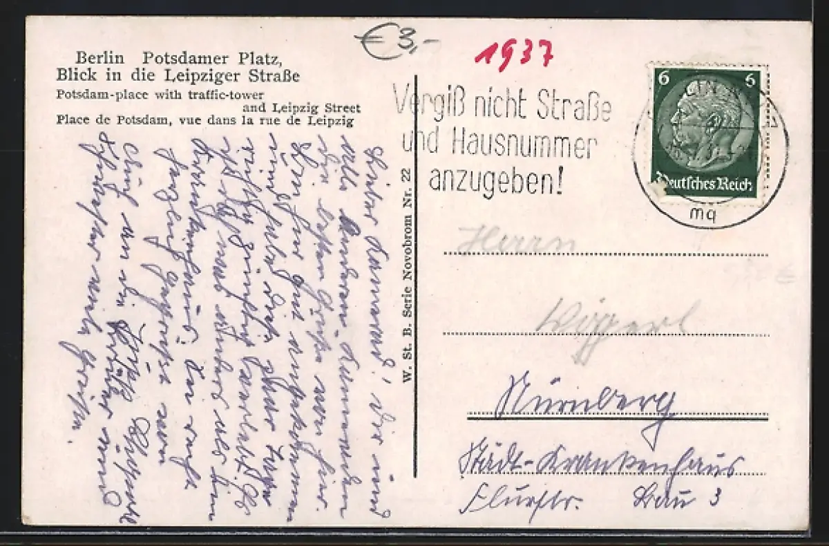 Personenbezogene Daten auf der Rückseite der Karte wurden durch blauen Textmarker unkenntlich gemacht. Die blauen Stellen sind auf die Vorderseite durchgeweicht und wirken sich negativ auf das Postkartenfoto aus