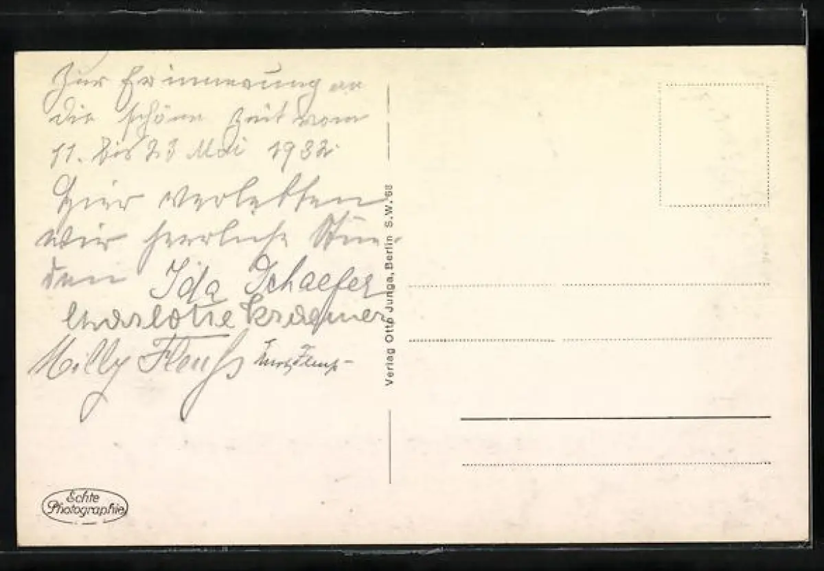 Personenbezogene Daten auf der Rückseite der Karte wurden durch blauen Textmarker unkenntlich gemacht. Die blauen Stellen sind auf die Vorderseite durchgeweicht und wirken sich negativ auf das Postkartenfoto aus