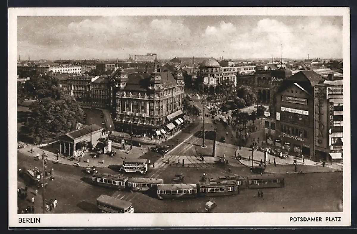 AK Berlin-Tiergarten, Strassenbahn und Bus am Potsdamer Platz aus der Vogelschau