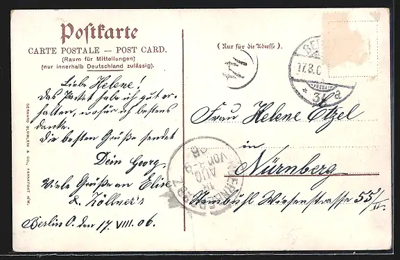 alte Ansichtskarte, gelaufen 1905, Briefmarke entfernt, guter Zustand