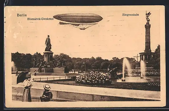 AK Berlin-Tiergarten, Zeppelin zwischen Bismarck-Denkmal und Siegessäule