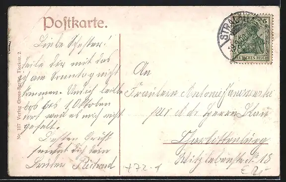 alte Ansichtskarte, gelaufen 1908, Eckknicke oben, guter Zustand