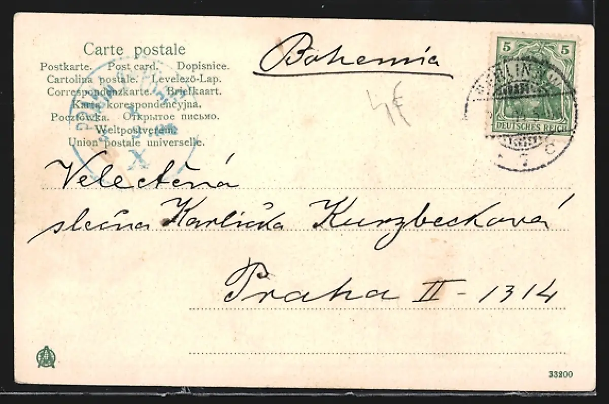Personenbezogene Daten auf der Rückseite der Karte wurden durch blauen Textmarker unkenntlich gemacht. Die blauen Stellen sind auf die Vorderseite durchgeweicht und wirken sich negativ auf das Postkartenfoto aus