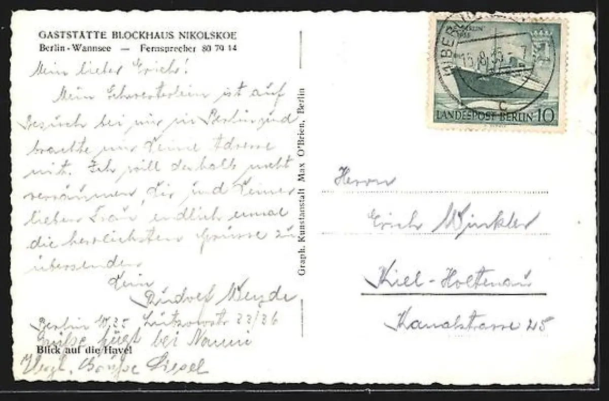 AK Berlin-Wannsee, Gaststätte Blockhaus Nikolskoe, Blick auf die Havel