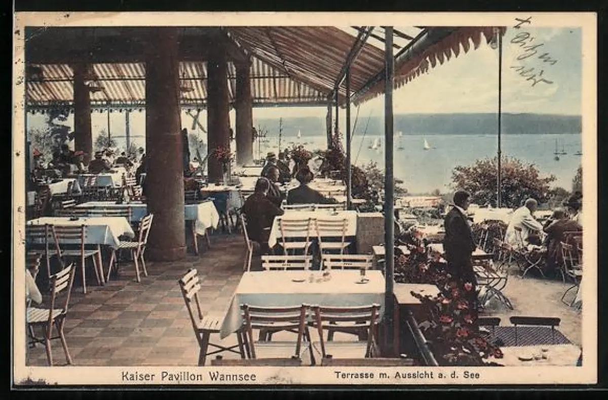 AK Berlin-Wannsee, Kaiser Pavillon, Terrasse mit Aussicht auf den See