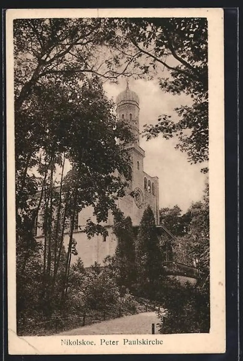AK Berlin-Wannsee, Nikolskoe, Peter Paulskirche mit Grünanlagen