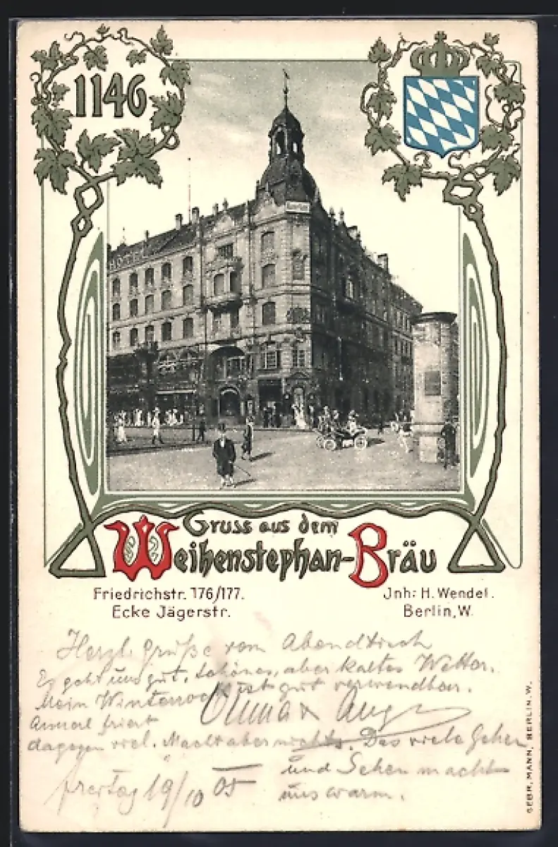 AK Berlin, Weihenstephan Bräu, Friedrichstrasse 176 /177 Ecke Jägerstrasse, Wappen