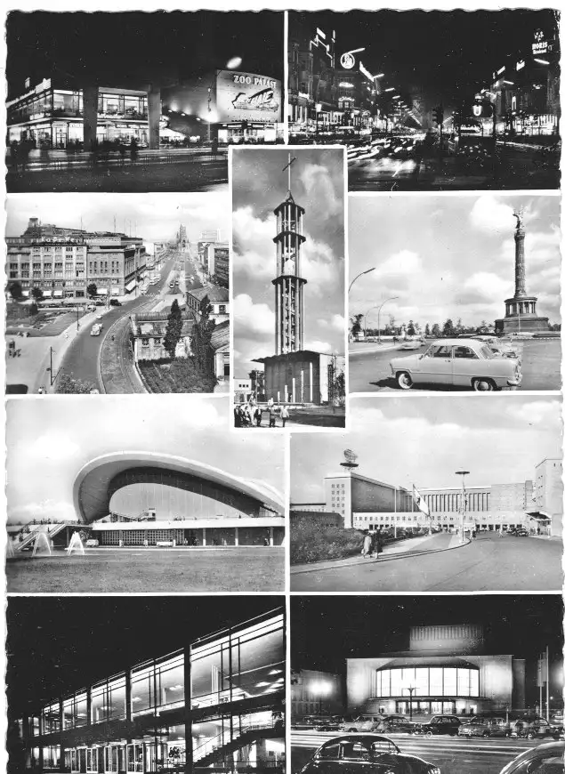 Ansichtskarte Berlin [West] neun innerstädt. Abb., gestaltet Am Zoo, Kurfürstendamm, Tauentzienstr., Kaiser-Friedrich-Kirche, Siegessäule, Kongresshalle, Flugh. Tempelhof, Musikhochschule, Schiller Theater Erhaltung I-II ungelaufen, um 1962 Verlag: S. Schatz, 1 Berlin 62 Der