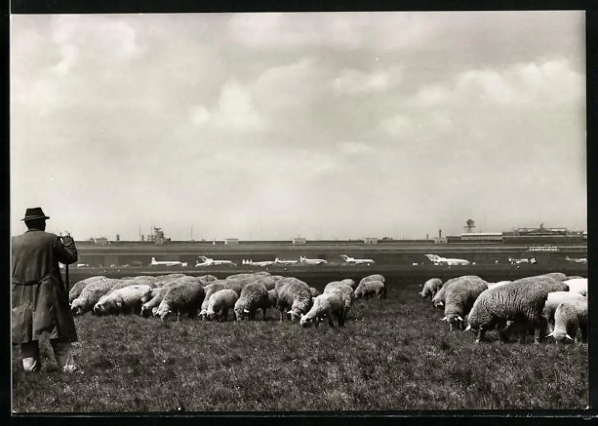AK Berlin, Zentral-Flughafen Tempelhof, Schäfer mit Schafherde