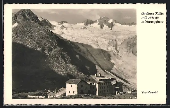 AK Berliner Hütte, Aussenansicht der Berghütte mit Mösele und Waxeggkees, mit Hüttenstempel
