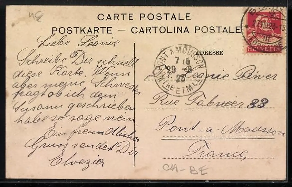Personenbezogene Daten auf der Rückseite der Karte wurden durch blauen Textmarker unkenntlich gemacht. Die blauen Stellen sind auf die Vorderseite durchgeweicht und wirken sich negativ auf das Postkartenfoto aus
