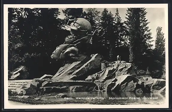 AK Bern, Internationale Postwertzeichen-Ausstellung 1910, Skulptur mit Weltkugel