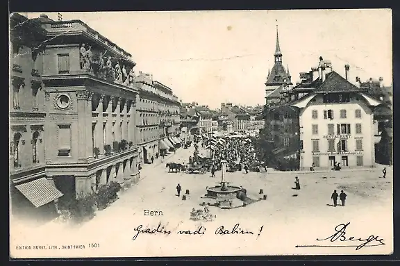 AK Bern, Strassenpartie mit Marktständen und Brunnen
