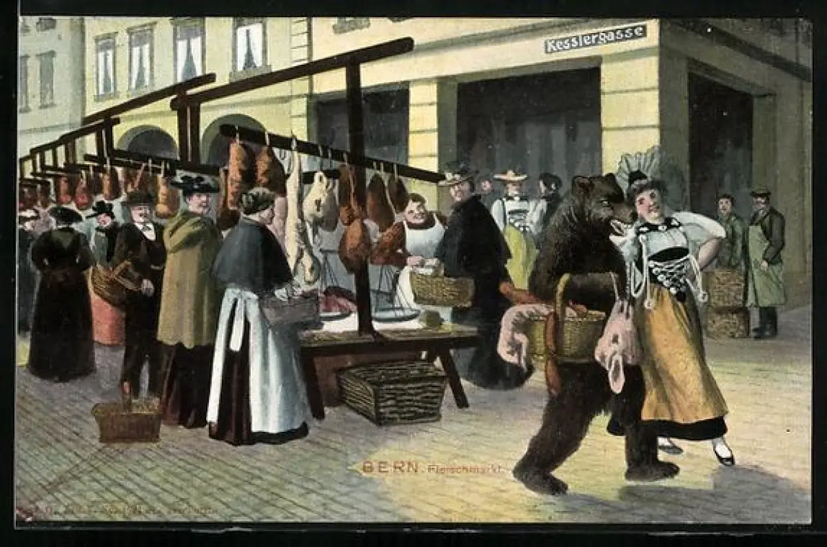 AK Bern, vermenschlichte Tiere beim Einkauf auf dem Fleischmarkt