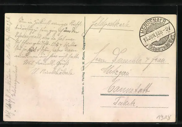 Personenbezogene Daten auf der Rückseite der Karte wurden durch blauen Textmarker unkenntlich gemacht. Die blauen Stellen sind auf die Vorderseite durchgeweicht und wirken sich negativ auf das Postkartenfoto aus