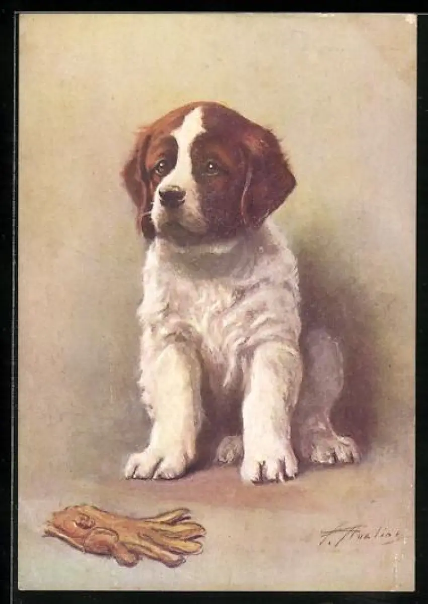 AK Bernhardinerwelpe mit einem zerkauten Handschuh, Portrait