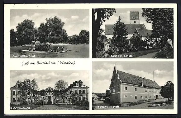 AK Bertoldsheim, Kirche mit Schule, Schloss, Donau-Überfahrt