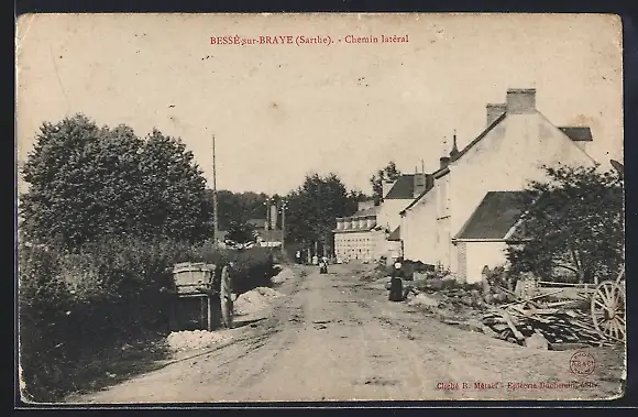 AK Bessé-sur-Braye, Chemin latéral avec maisons et charrette