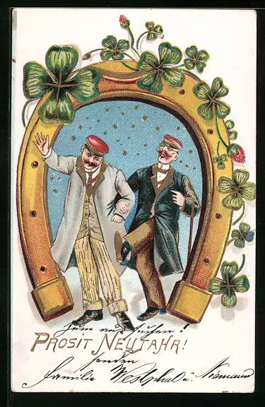 AK Betrunkene Herren mit Kleeblättern und Hufeisen, Prosit Neujahr