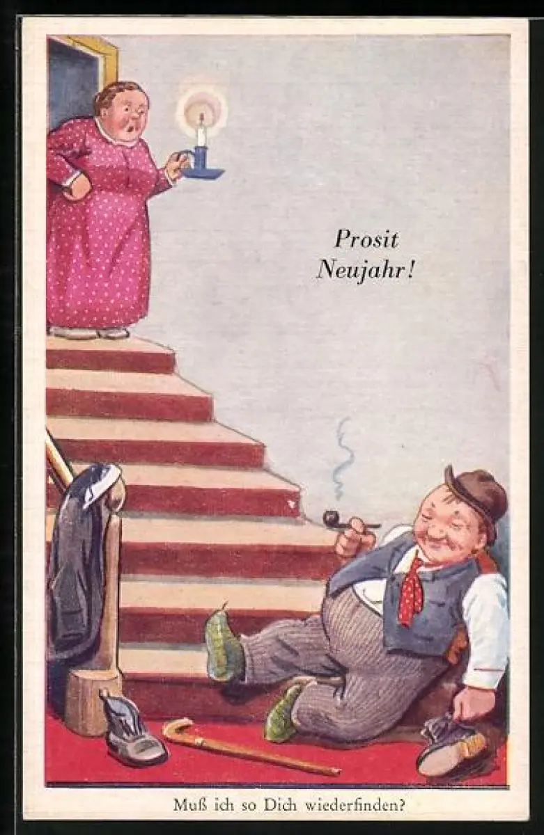 AK Betrunkener Mann wird von seiner Frau auf der Treppe entdeckt