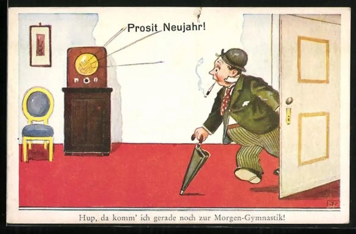 AK Betrunkener an der Tür vor dem Radio, Neujahrsgruss