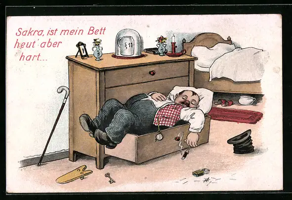 AK Betrunkener schläft in der Kommode, Trinkerhumor